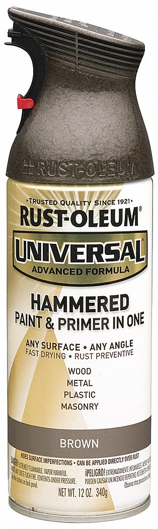 Oil-based formula with excellent adhesion resists fading and chipping. Rust-Oleum Universal Hammered Spray Paint is a paint and primer in one that provides superior coverage and durability on any surface and at any anglewith the unmatched comfort of our patented trigger technology. All Surface Hammered Brown Spray Paint and primer in One is designed for diverse substrates and works on virtually any surface.
