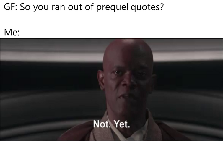Dice needs to capitalize on the popularity of Star Wars memes that have a constant presence across the internet. Can you choose which of the three Star Wars Prequels each frequently-memed quote originates from. Quotes tagged as prequel showing 1 7 of 7 don t get smart you two are in a heap of trouble snarled anderson. Get the ad-free. Can you pick the words missing from these lines from the Star Wars Prequel Trilogy that have become memes. It is rather cheesy but most of the dialogue from the prequels is anyways. Star wars prequel meme quotes. Imagine if there was a scene like this in the movie where he actually drove to work listening to such songs. Explore prequel quotes by authors including james wan schoolboy q and harshvardhan rane at brainyquote.